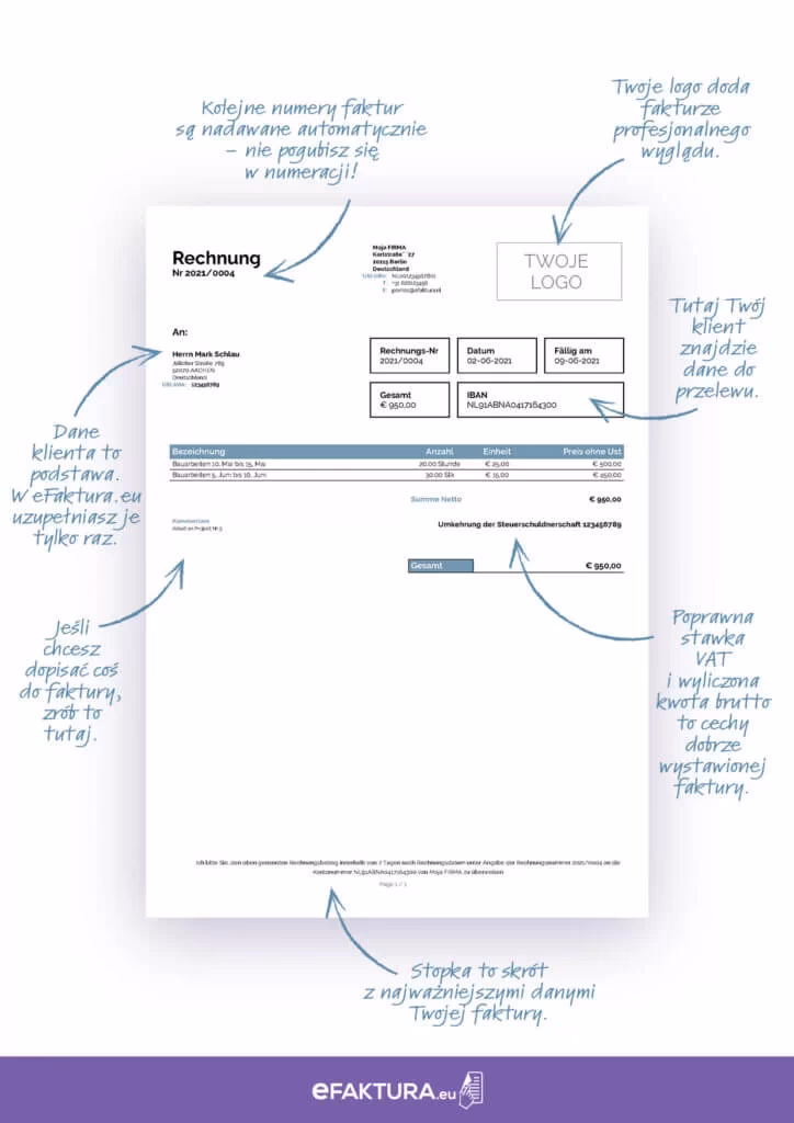 - Czy faktura musi być w języku niemieckim? Tak, zalecane jest wystawienie w języku niemieckim lub z tłumaczeniem, aby była akceptowalna przez niemieckie władze.