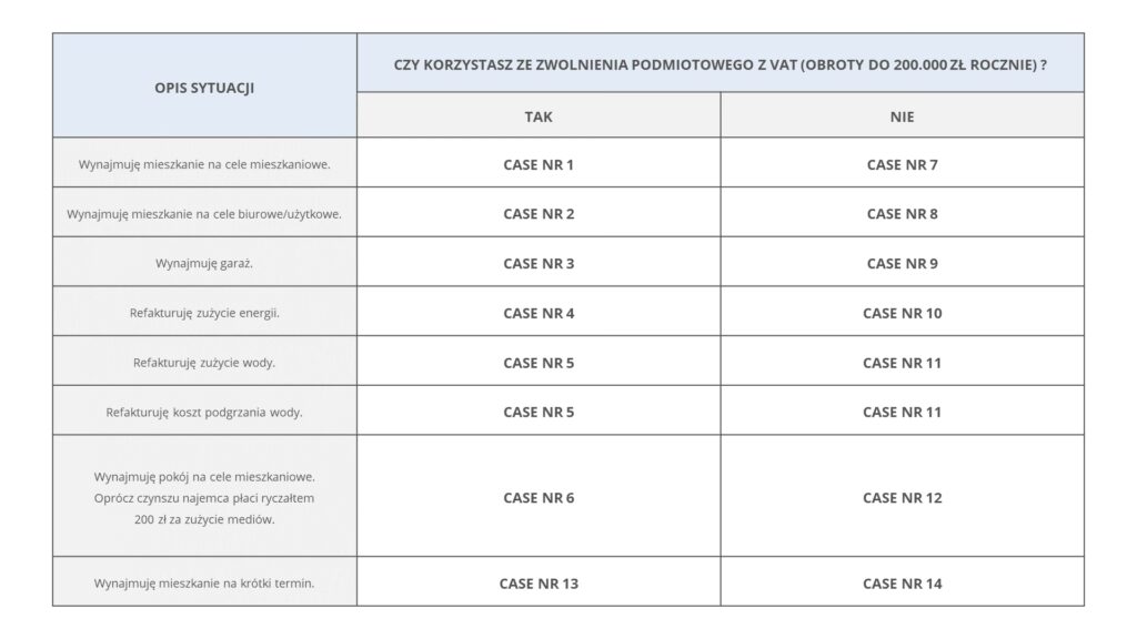 | Wynajem na cele nieopodatkowane | Brak prawa do odliczenia | Brak prawa do odliczenia |