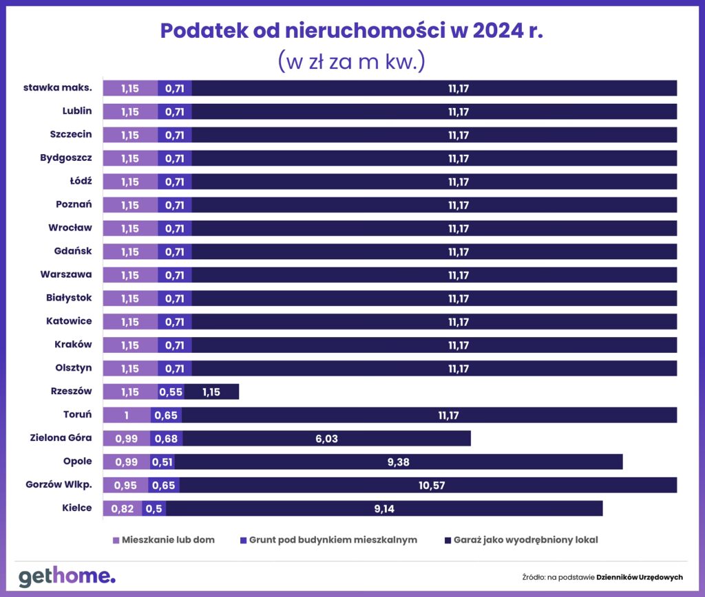 | Budynki mieszkalne | 1,19 zł/m² | W tym nieruchomości wykorzystywane częściowo do celów mieszkalnych |