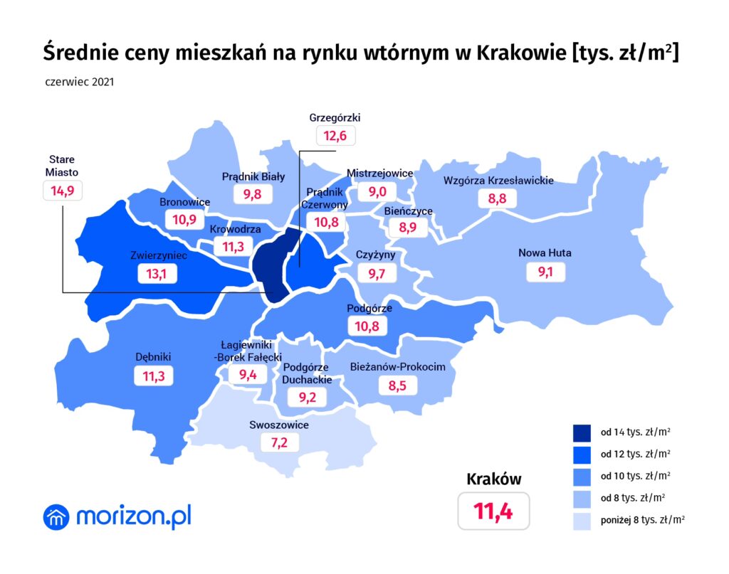 - Jakie są średnie ceny mieszkań w Krakowie w 2024 roku? Średnia cena metra kwadratowego na rynku pierwotnym wynosi około 16 tysięcy złotych, a na rynku wtórnym 13,3 tysiąca złotych.